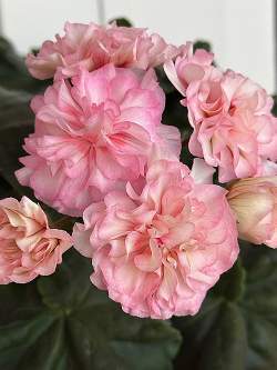 Пеларгония ТА_Горная Карусель. Зонартиковый гибрид, компактный. Листья крупные, слегка волнистые, ярко-зеленые. Цветки махровые, переливаются от бежевого до розового. Крупные, очаровательные, неповторимые. Зимой нужна подсветка и содержание в прохладном месте.