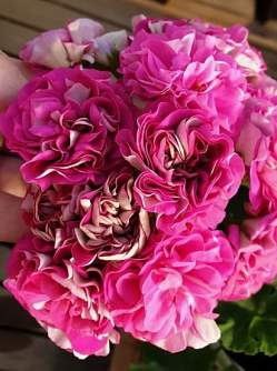 Пеларгония розебудная Ю_Грушенька. Зонартик. Куст стандартного размера, пышный, растет быстро, хорошо формируется. Цветки прекрасные, яркие, темно-розовые с сиреневым оттенком, имеют светлый реверс, крупные. Густомахровые, розовидные. Соцветия очень большие, цветение долгое, обильное. Соцветия длинные, но крепкие, хорошо держат шапку цветков.