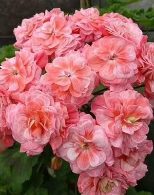 Пеларгония розебудная ЮВ_Карфаген. Зонартик, который выделяется своими крупными махровыми розовидными цветами лососевого цвета. Причем, каждый цветок многослойный и имеет прожилки на лепестках. Цветоносы прочные, образуются в большом количестве. Куст красивый, растет вширь. Растет медленно.