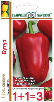 Перец Бутуз авторский 0,4 г. Среднеранний (115-130 дней от всходов до начала плодоношения) среднерослый (до 80 см) сорт. Рекомендуется для выращивания в пленочных и остекленных теплицах. Растение полураскидистое. Листья среднего размера, темно-зеленые. Плоды пониклые, конусовидные, глянцевые, ароматные, с насыщенным вкусом и нежным ароматом. Окраска незрелых плодов зеленовато-белая, зрелых — красная. Число гнезд 2-3. Масса плода 180 г, толщина стенки 7 мм. Мякоть нежная, сладкая, сочная. Вкус хороший.
