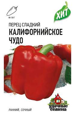 Перец Калифорнийское чудо. Раннеспелый (100-129 дней от всходов до начала плодоношения) сорт для открытого грунта и пленочных укрытий. Растение высотой до 75 см. После высадки в открытый грунт удаляют все боковые побеги и листья до первой развилки. Плоды кубовидной формы, гладкие, глянцевые, в технической спелости зеленые, в биологической — красные, массой 80-130 г. Толщина стенки плода 4,0-5,5 мм (до 8,3 мм). Вкус сладкий, аромат ярко выражен. Рекомендуется для использования в свежем виде и для консервирования. Урожайность одного растения 3,5-4,4 кг/м2.
