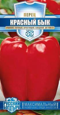 Перец Красный бык. Продуктивный, ранний (95 дней от всходов до начала плодоношения) сорт для выращивания под временными пленочными укрытиями и в открытом грунте. Формирует мощный куст высотой до 150 см. Плоды крупные, диаметром 9 см, массой 200-250 г (при хорошем уходе отдельные вырастают до 350-400 г), кубовидные, в технической спелости темно-зеленые, в биологической спелости ярко-красные, с толстыми сочными сладкими стенками 6-8 мм. Сорт характеризуется устойчивостью к основным заболеваниям перцев. Рекомендуется для употребления в свежем виде, фарширования, замораживания и консервирования. Выращивают рассадным способом. Рассаду пикируют в фазе 1-2 настоящих листьев. После высадки в теплицу у растений удаляют боковые побеги и листья до первой развилки и подвязывают к опоре.