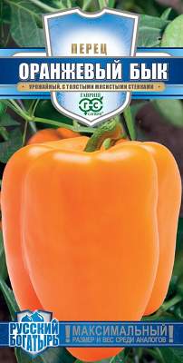 Перец Оранжевый бык. Перец сладкий — популярная овощная культура, которую выращивают и дачники, и фермерские хозяйства. В нем содержится масса витаминов и полезных веществ, незаменимый ингредиент в кулинарии: приготовлении свежих салатов, гарниров, подлив и заготовок впрок. Высокоурожайный ранний (100-110 дней от всходов до начала плодоношения) сорт для выращивания под временными пленочными укрытиями и в открытом грунте. Формирует куст высотой 80-110 см. Плоды крупные, массой 250 г (отдельные до 300-400 г), кубовидные, с толстыми мясистыми стенками до 10 мм. Незрелые перцы зеленого цвета, зрелые — ярко-оранжевого. Сорт устойчив к вирусу табачной мозаики. Товарная урожайность — 7,0-14,0 кг/м? (в зависимости от условий выращивания). Используют в свежем виде, фаршируют, замораживают и консервируют. Выращивают рассадным способом. Глубина заделки семян до 1 см. Рассаду пикируют в фазе 1-2 настоящих листьев. После высадки в теплицу у растений удаляют боковые побеги и листья до первой развилки и подвязывают к опоре. Нельзя высаживать рассаду сладких и острых сортов перца рядом, т.к. происходит переопыление и сладкий перец приобретает горький вкус.