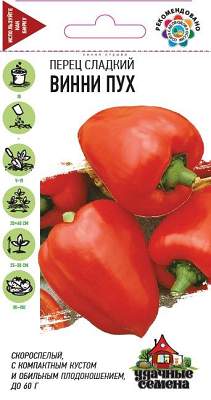 Перец Винни Пух. Скороспелый (107-111 дней от всходов до плодоношения) сорт для открытого грунта и пленочных укрытий. Растение низкорослое, компактное, высотой 25-30 см с букетным расположением плодов. Подходит для выращивания на окне. Для получения максимального урожая растения высаживают загущенно. Плод конусовидной формы с заостренной верхушкой, массой 48-60 г. Толщина стенки 5-6 мм. Окраска в технической спелости салатная, в биологической красная. Урожайность 1,6-1,8 кг/м2. Пригоден для транспортировки и длительного хранения.