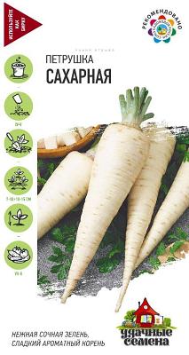 Петрушка корневая Сахарная. Двулетнее растение, в первый год получают зелень, во второй — корнеплоды. Скороспелый (97-103 дня от всходов до технической спелости) сорт. Розетка раскидистая, число листьев 20-40. Черешки светло-зеленые, длиной 20-28 см. Корнеплод конический, остроконечный, длиной 20-30 см, диаметром 4,0-7,0 см. Окраска поверхности серовато-белая, мякоть белая, сердцевина светло-желтая, неправильной 4-угольной формы. Масса одного растения 80-90 г, корнеплода 30-60 г. Используются корнеплоды и листья. Уборку корнеплодов и листьев проводят периодически, по мере необходимости. Посев в грунт в конце апреля — начале мая на глубину 1 см. Перед посевом семена необходимо замочить в течение суток в теплой воде. Урожайность корнеплодов с листьями 2,3-5,7 кг/м2, корнеплодов — 1,0-2,8 кг/м2.