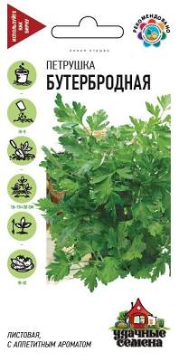 Петрушка листовая Бутербродная. Среднеспелый (65-75 дней от всходов до уборки зелени) сорт. Розетка полувертикальная, с большим количеством листьев тёмно-зелёного цвета. Листья сильнорассеченные, гладкие, очень ароматные. Масса зелени с одного растения 60-100 г. Хорошо отрастает после срезки. Корневища перезимовывают в почве и быстро дают свежую зелень ранней весной. Рекомендуется для употребления в свежем, сушеном и консервированном виде. Уборку листьев производят периодически, по мере необходимости. Перед посевом семена необходимо замочить в течение суток в теплой воде. Урожайность 2,8-4,8 кг/м2.