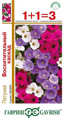 Петуния Восхитительный каскад смесь DH. Необыкновенно красивое растение c побегами длиной до 80 см. Молодые кустики прямостоячие, вырастая, побеги свешиваются и образуют настоящую лавину из крупной разнообразной окраски цветков до 8 см в диаметре. Выращивают рассадным способом. Посев проводят поверхностно, под стекло (после появления всходов стекло убирают). В зимние месяцы (январь-февраль) досветка обязательна. Без дополнительного освещения петунию высевают не раньше марта. Всходы появляются через 7-12 дней. На постоянное место высаживают, когда минует опасность заморозков. Светолюбива и достаточно засухоустойчива. Предпочитает легкие, плодородные, хорошо дренированные почвы. Великолепно украсит балконные ящики, вазы и подвесные кашпо. Растения быстро восстанавливают декоративность после сильного дождя. Для более пышного цветения завядшие цветки удаляют.