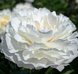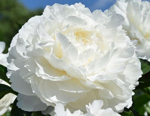 Пион Amalia Olson (Амалия Олсон). Цветок корончатый, огромный, диаметром 20 см, плотный, махровый. Цвет белый с кремовой серединкой, лепестки образуют шапочку. Куст раскидистый, листья очень крупные, стебли изгибаются под тяжестью цветка. Аромат тонкий.