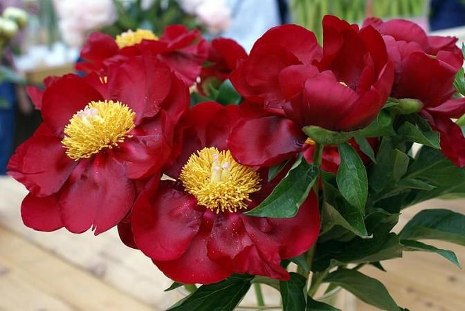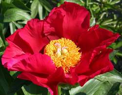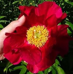 Пион America (Америка). Межвидовой гибрид. Шикарный огромный цветок диаметром 21 см. Лепестки блестящие, в центре золотой помпон из тычинок. Листья крупные, ярко-зеленые. Стебли крепкие, толстые. Высота 80 см. Цветет в ранние сроки.