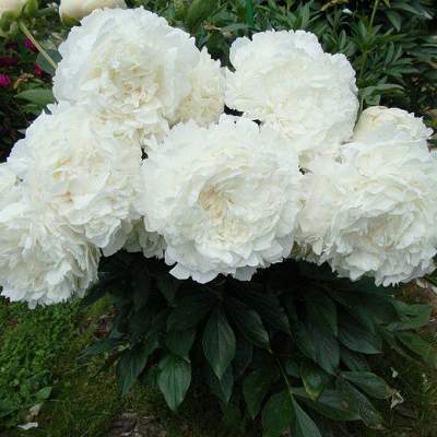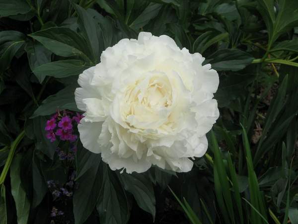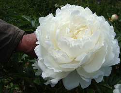 Пион Ann Cousins (Эн Казенс). Махровый розовидный. Цветок диаметром 20 см, плотный, чисто-белый. Лепестки крупные, плотно сложенные. Высота 90 см. Стебли сильные, но изгибаются. Развивается медленно. Очень позднего срока цветения.