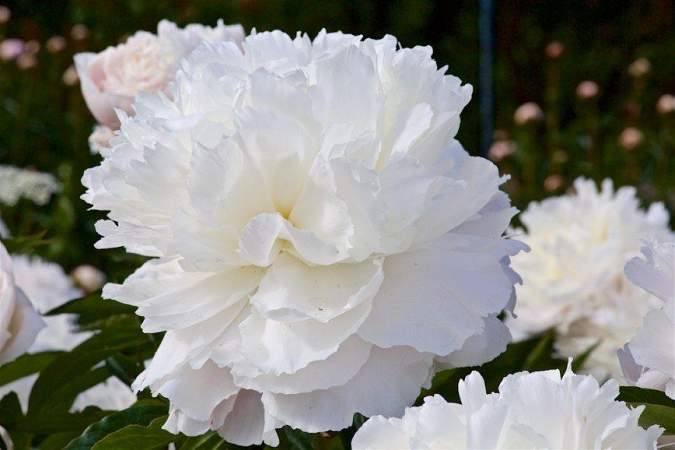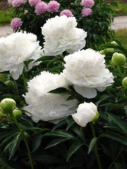 Пион Argentine (Аргентина). Махровый розовидный-шаровидный. Цветок густомахровый, плотный, диаметром 16 см с несколькими рядами крупных лепестков, нежно-бледно-розовый, позднее белый со светло-кремовым. Высота 90 см. Многостебельный. Густооблиственный. Листья крупные, тёмно-зелёные. Аромат лёгкий, приятный. Средний. Редко бывает в продаже.