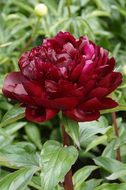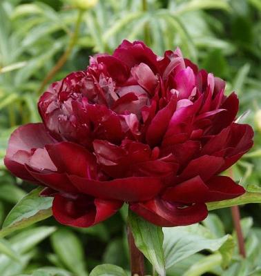 Пион Armani (Армани). Один из самых тёмных сортов. Цветок махровый, вначале рубиново-красный, затем бордово-красный. Лепестки шелковистые. Листва зелёная глянцевая, осенью — бордовая. Стебли бордовые.