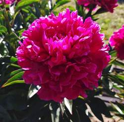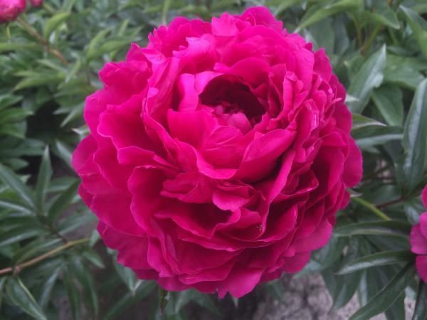 Пион Avis Varner (Эвис Варнер). Молочноцветковый; махровый шаровидный. Лепестки уложены очень красиво. Цветок темно-малиновый, богат оттенками, бархатистый, крупный. Внешние лепестки крупнее внутренних, что и создает восхитительную форму. Цветок красив на всех стадиях роспуска. Побеги очень прочные, каждый несет по три бутона. Срок цветения средний. Высота куста 90 см.