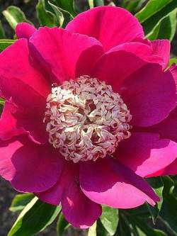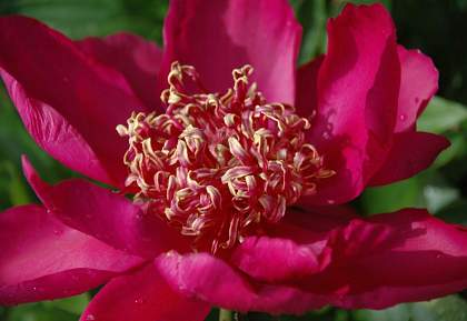 Пион Barrington Belle (Баррингтон Бель). Цветок анемоновидный, крупный 16 см, густо красно-малиновый с широким центральным пучком из красных или розовых лепестков с яркими золотистыми краями. Куст средний 80 см, стебли прочные. Форма цветка японская. Цветение обильное в средние сроки.
