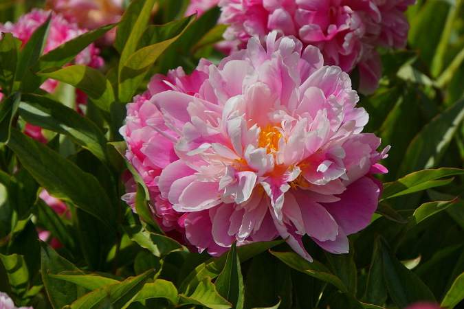 - Несколько пионов рядом — это уже большая однородная масса резной листвы. Если высаживать рядом другие растения, то лучше с цельными листьями. Это лилейники, ирисы, хосты, бадан.