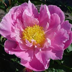 Пион Bernice Carr (Бернис Карр). Межвидовой гибрид (Nippon Gold x Cytherea). Форма кубковидная, махровый или полумахровый. Листья крупные, тёмно-зелёные, куст пропорциональный, красивый весь сезон, высотой 80 см. Цветок 18 см и более. Аромат слабый. Срок цветения средний.