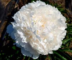 Пион Brother Chuck (Бразер Чак). Густомахровый пион свежего белого цвета с едва уловимым розовым отсветом и чуть желтоватой середкой, из-за чего выглядит светящимся изнутри. Крупные, слегка волнистые лепестки с атласным отливом.
