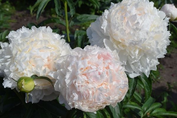 Пион Brother Chuck (Бразер Чак). Густомахровый пион свежего белого цвета с едва уловимым розовым отсветом и чуть желтоватой середкой, из-за чего выглядит светящимся изнутри. Крупные, слегка волнистые лепестки с атласным отливом.