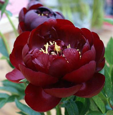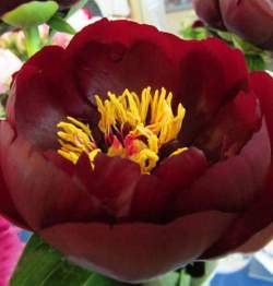 Пион Buckeye Belle (Бакай Бель). Полумахровый. Цветок розовидный, пяти-шестирядный, диаметром 16 см, тёмно-красно-коричневый с крупными контрастными тычинками.