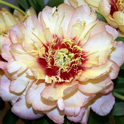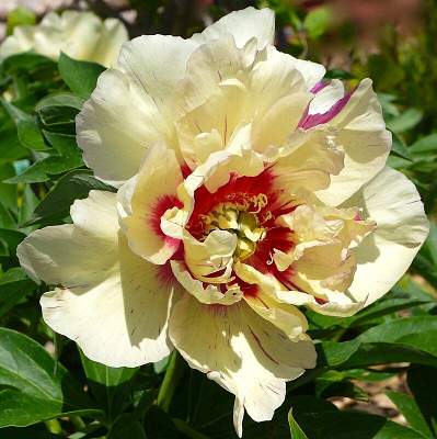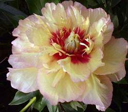 Пион Callies Memory (Кэллиз Мемори). Цветок полумахровый, диаметром 15-20 см, кремово-жёлтый до персикового с каштановыми пятнами у основания центральных лепестков. Этот пион лучше цветет на солнечном месте. Относится к неприхотливым растениям. Пион очаровывает, благодаря пышному и продолжительному цветению (до 5 недель).