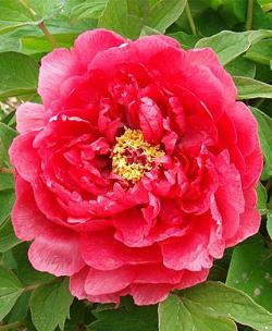 Пион Cao Zhou Hong (Красная Трава). Роскошный цветок лотосовидной формы. Цвет насыщенный коралловый. Лепестки фестончатые. У основания лепестков едва заметное темное пятнышко.