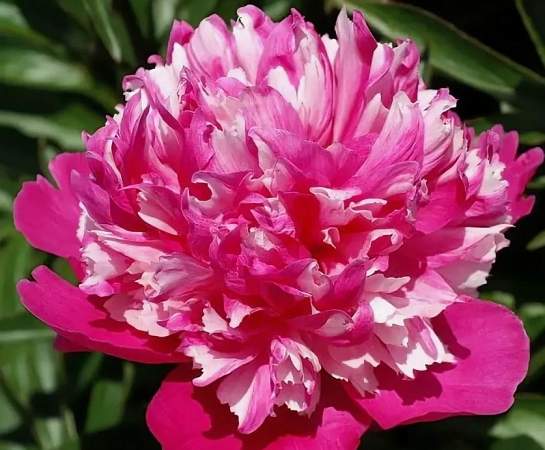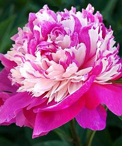Пион Celebrity (Селебрити). Цветок махровый бомбовидный, диаметром до 18 см. Внешние лепестки крупные, малиновые, внутренние узкие, вперемешку сливочно-желтые и малиновые. Ароматный. Срок цветения средний.
