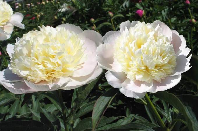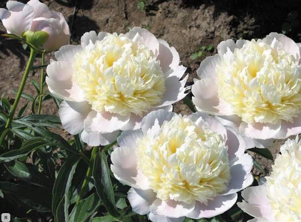 Пион Charles White (Чарльз Вайт). Махровый шаровидный. Цветок изящный, огромный (22 см), с закручивающимися лепестками, белый с оттенками жёлтого и розового (в начале цветения). Листья крупные, рассеченные, блестящие. Ранний.