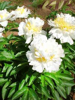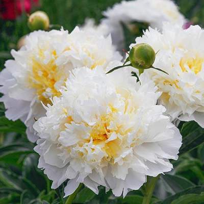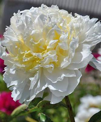 Пион Cheddar Cheese (Чеддар Чиз). Очень крупный шикарный цветок. Махровый бомбовидный. Цветок диаметром 20 см, в начале плоский, с несколькими рядами белых лепестков и желтыми петалодиями в центре. Затем вырастающая корона из белых лепестков перекрывает жёлтые петалодии. Высота 90 см. Стебли мощные. Листья крупные, тёмно-зеленые. Срок цветения средне-поздний.