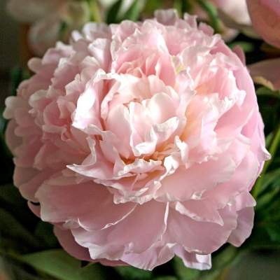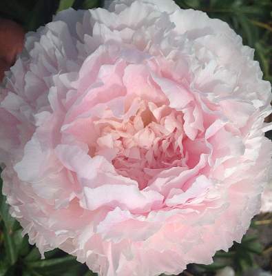 Пион Chiffon Parfait (Шифон Парфе). Махровый розовидный — шаровидный. Цветок диаметром 19 см, красивой формы, бледно-розовый c лососёвым оттенком, затем белеет. Ароматный. Куст высотой 85 см. Стебли прочные с боковыми бутонами. Хорошо подходит для соезки. Срок цветения поздний.