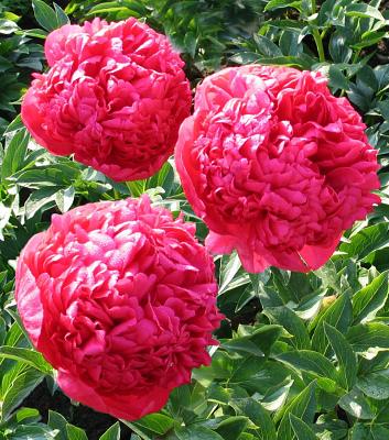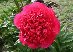 Пион Command Performance (Команд Перфоманс). Межвидовой гибрид. Среднего срока цветения. Бутон массивный. Цветок махровый бомбовидный, изумительного яркого пурпурно-красного цвета, очень крупный, в вазе может достигать 23 см в диаметре. Высота 80 см, растёт энергично, стебли прочные, но иногда изгибаются. Гранд-чемпион национальной выставки США 1998 года.