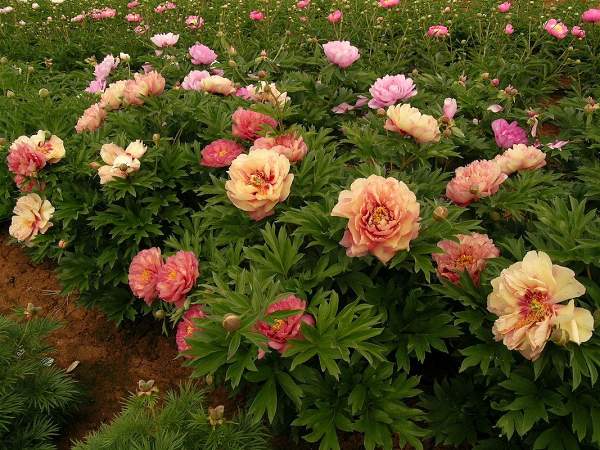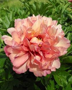 Пион Copper Kettle (Коппер Кетл). Полумахровый-махровый. Цветок диаметром 20 см, ароматный. Окраска уникальная, в процессе цветения изменяется от красно-жёлто-оранжевой до кремово-жёлтой. В лепестках случайные жёлтые полосы и в основании красно-сиреневые пятна.
