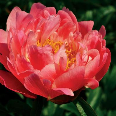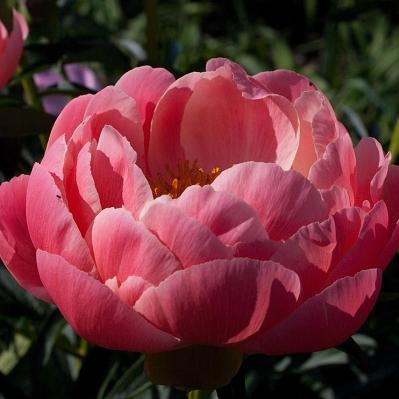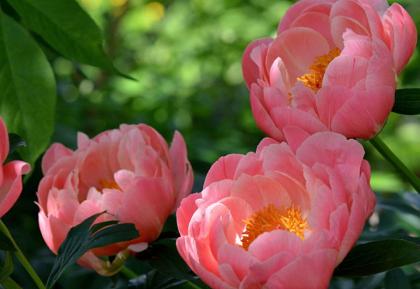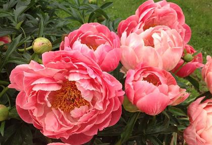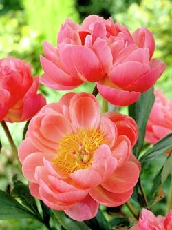 Пион Coral Charm (Корал Чарм). Цветок полумахровый, огромный, кораллово-персиковый, блестящий, при отцветании бледнеет до мандариново-жёлтого. В центре светло-жёлтые тычинки. На взрослом растении одновременно цветки различных оттенков. Куст высотой 100 см. Стебли сильные. Золотая медаль американского общества пиона, 1986 г.