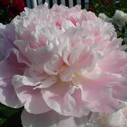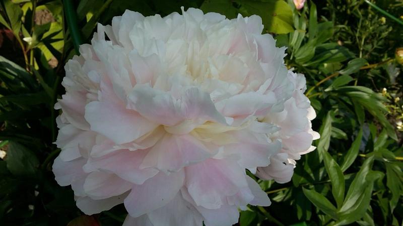 Пион Cornelia Shaylor (Корнелия Шейлор). Махровый шаровидный. Цветок диаметром 14-15 см, высокий, розово-перламутровый, на внешних лепестках розово-сиреневый оттенок, в короне кремово-розовый, в центре с розовым насыщением.