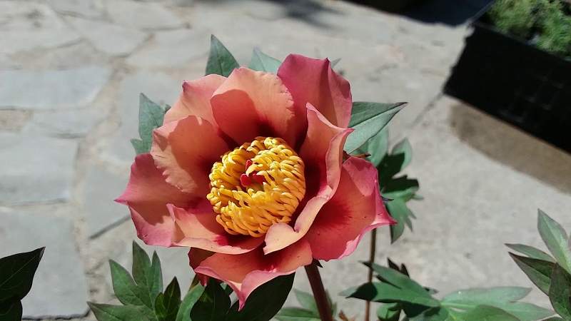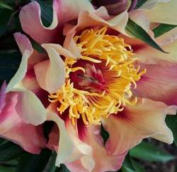 Пион Court Jester (Курт Джестер). Цветок простой, диаметром 16 см, желто-оранжевый с темно-красными пятнами в основании лепестков, по мере цветения лепестки становятся желтовато-сливочными с фиолетовыми пятнами. Тычинки желтые, пестики с красными рыльцами. Куст округлый, высотой 60-65 см. Особенно красив, когда распускаются боковые бутоны. Среднего срока цветения. Ароматный цветок.