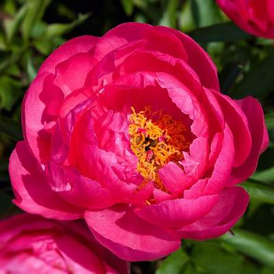 Пион Cytherea (Цитерия). Цветок диаметром 16 см, полумахровый, трёх-пятирядный. Цвет светящийся насыщенно-розово-красный, позднее светлеет до лососёво-розового. Кончики лепестков бледно-персиковые. Лепестки ровные, вогнутые, длинные, образуют чашу. Тычинки короткие, ярко-жёлтые.