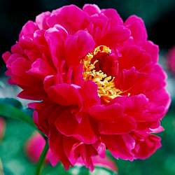 Пион Da Hong Chi Jin (Обитель Богов). Пышный ароматный цветок красного цвета с золотистыми тычинками. Лепестки блестящие. Размер цветка 15 х 12 см. Высота растения 70-80 см. Позднее цветение. Имеет приятный легкий аромат. Праздник, а не пион!