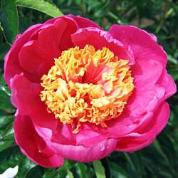 Цветок японской формы (анемоновидный), тёмно-розовый с кремово-жёлтыми стаминодиями. Ароматный. Куст мощный, высота до 100 см. Сорт средне-позднего срока цветения.