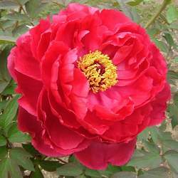 Пион древовидный Xue Gang, Asahi-minato (Сюэ Ган, Асахи-минато). Цветки огромные, диаметром 18 см и более, полумахровые, красные, немного светлее, чем у сорта Taiyo. Аромат хороший. На черешках нет пурпурных линий. Кусты мощные, высотой 120-150 см. Цветение в мае-июне.