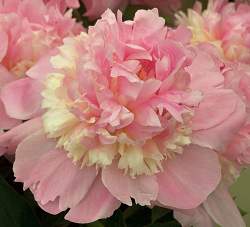Пион Eden's Perfume (Иденс Перфьюм). Высота 80-90 см. Махровый пион удивит Вас приятным и сильным ароматом, напоминающим запах дамасской розы. Цветок светло-розовый с воротником из светло-кремово-розовых лепестков. Особенностью этого пиона является двойная окраска соцветий. Густые бутоны с мощным ароматом роз привлекают бабочек и пчел. Тычинки и пестики отсутствуют. Стебли крепкие.