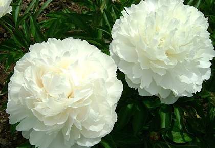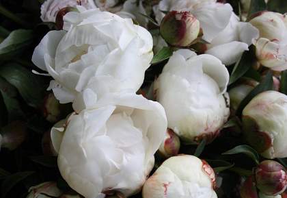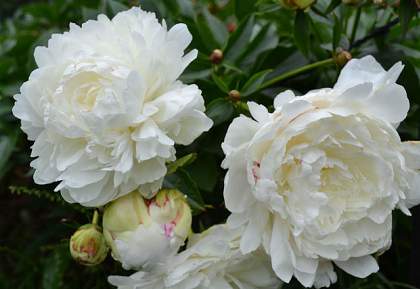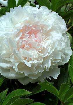 Пион Elsa Sass (Эльза Сасс). Махровый розовидный. Цветок идеального сложения, диаметром до 20 см, плотный, кремово-белый с розовым оттенком и желтоватым насыщением от центра. Все лепестки крупные. Аромат приятный. Высота 70-90 см. Листья тёмно-зелёные, крупные, блестящие. Стебли прочные. Позднего срока цветения. Золотая медаль АмОП 1943 г.