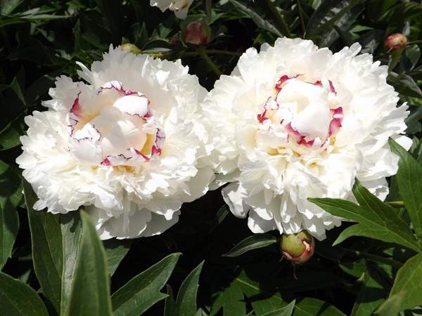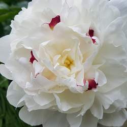 Пион Festiva Maxima (Фестива Максима). Цветок густомахровый, крупный, плотный, чисто-белый, в центре на кончиках лепестков метки красного. Цветение обильное, продолжительное. Аромат нежный, приятный. Образует боковые махровые цветки. Стебли прочные.