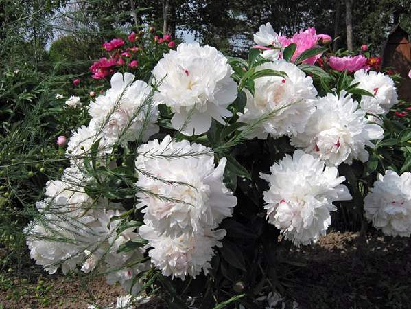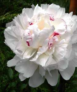 Пион Festiva Maxima (Фестива Максима). Махрово-розовидный. Цветок густомахровый, крупный, плотный, чисто-белый, в центре на кончиках лепестков метки красного. Цветение обильное, продолжительное. Аромат нежный, приятный. Образует боковые махровые цветки. Стебли прочные. Листья крупные, тёмно-зелёные. Исключительная устойчивость в культуре.