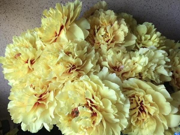 Срезать пионы для букета можно не более, чем у одной трети куста. Необходимо беречь вегетативную массу растения — его стебли и листья. Обрезку стеблей и листьев следует выполнять после сильных заморозков (в ноябре), позже, чем у травянистых пионов. Слишком ранняя обрезка приносит растениям большой вред. Листья сжигают, так как они могут быть источником распространения заболеваний.