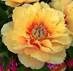 Пион Garden Treasure (Гарден Треже). Цветок очень крупный, махровый, золотисто-желтый с алым пятном в центре. Продолжительное цветение. Орден за ландшафтные заслуги.