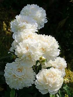Пион Gardenia (Гардения). Махровый розовидный полушаровидный. Цветок очень крупный, диаметром 22 см, розовеюще-белый, позднее кремово-белый, похож на цветок гардении. Аромат нежный. Очень много боковых бутонов, что обеспечивает длительное цветение. Высота 85-90 см. Стебли прочные. Листья крупные, тёмно-зелёные. Среднего срока цветения.