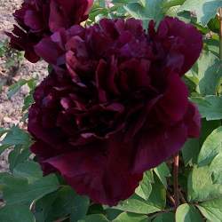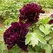 Древовидный пион Guan Shi Mo Yu (Черная Корона). Один из самых темных древовидных пионов. Кустарник достигает 150 см в высоту. Цветки крупные (17 см и более) махровые, корончатой формы.