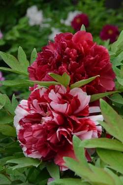 Пион древовидный Hua er Qiao (Сестры Киао). Окраска этого японского пиона часто двухцветная: пурпурно-красный с розовым либо белый с темно-фиолетовым вкраплением. Причем на одном кусте могут встречаться разные цветки. Сами лепестки плотные, стебли длинные, жесткие, цветки — вертикально расположенные, в форме розы. Взрослое растение может приносить до 100 цветков. Сорт великолепно подходит и для ландшафтного озеленения, и для срезки.