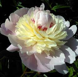Пион Jeanne d'Arc (Жанна д’Арк). Один из красивейших исторических пионов (Calot, 1858, Франция). Аромат легкий. Цветок махровый, многослойный, диаметром до 14 см. Внешние лепестки нежно-розовые, широкие. На них посажен ряд широких сливочно-желтых петалодий и в центре бело-розовая корона с малиновыми язычками.