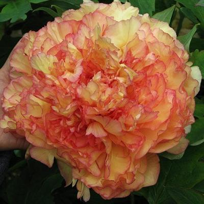 Пион древовидный Jin Ge (Кинко, Золотая Россыпь) - желтый пион с лепестками, имеющими красную окантовку, очень густой.