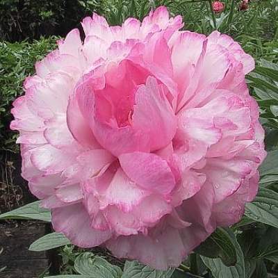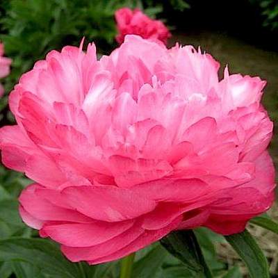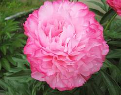 Пион Joker (Джокер). Межвидовой гибрид. Махровый. Цветок красивый, вначале тёмно-розовый, затем светлеет, а по краям появляется тонкая розовая кайма, все лепестки широкие, высота 80 см, стебли прочные, средне-раннего срока цветения. Куст сильный, цветы смотрят вверх.